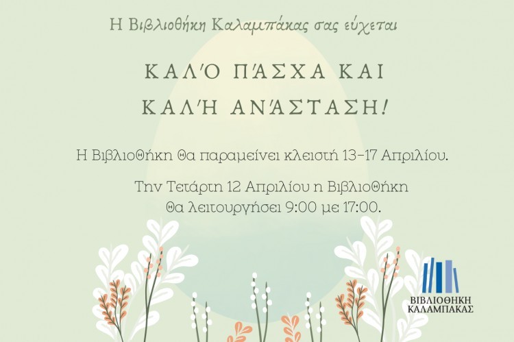 Θα θέλαμε να ενημερώσουμε το αναγνωστικό μας κοινό ότι η Βιβλιοθήκη θα παραμείνει κλειστή από τη Μ. Πέμπτη 13 Απριλίου έως και τη Δευτέρα του Πάσχα 17 Απριλίου.