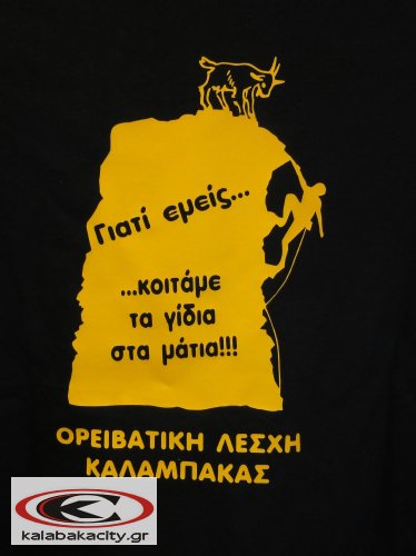Μπλουζάκια με έξυπνη στάμπα που περνά το δικό της μήνυμα κυκλοφόρησε η Ορειβατική Λέσχη Καλαμπάκας και παρουσιάστηκε στην κοπή της πίτας μου έγινε πριν ένα μήνα περίπου. Μπλουζάκια με έξυπνη στάμπα που περνά το δικό της μήνυμα κυκλοφόρησε η Ορειβατική Λέσχη Καλαμπάκας και παρουσιάστηκε στην κοπή της πίτας μου έγινε πριν ένα μήνα περίπου. Το μήνυμα “Γιατί.. εμείς κοιτάμε τα γίδια στα μάτια!!” είναι αρκετά έξυπνο και με νόημα. Το σχολιάσαμε και στο περιοδικό Καλαμπάκα City και μέσα από το μήνυμα φαίνεται η δουλειά που γίνεται από την Ορειβατική Λέσχη Καλαμπάκας που σε κάθε περιστατικό είναι δίπλα μας. Ακόμα και στα “γίδια”.. που εγκλωβίζονται ψηλά στου βράχους των Μετεώρων. Πάντα ψηλά παιδιά…