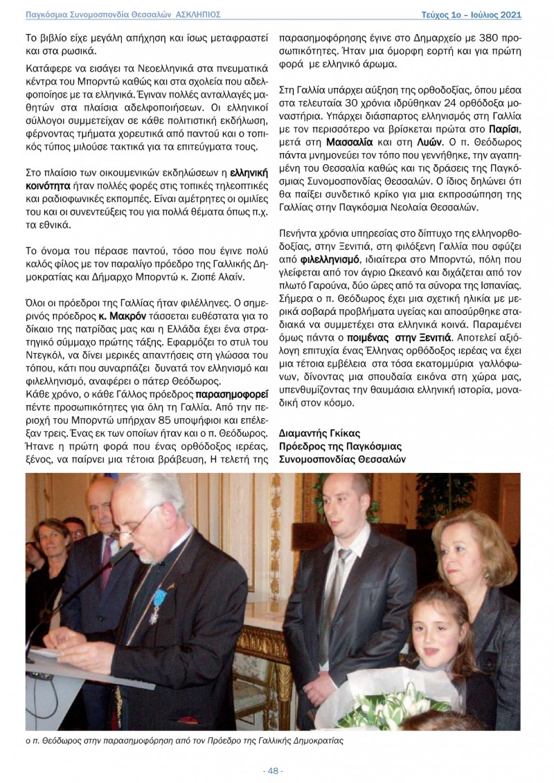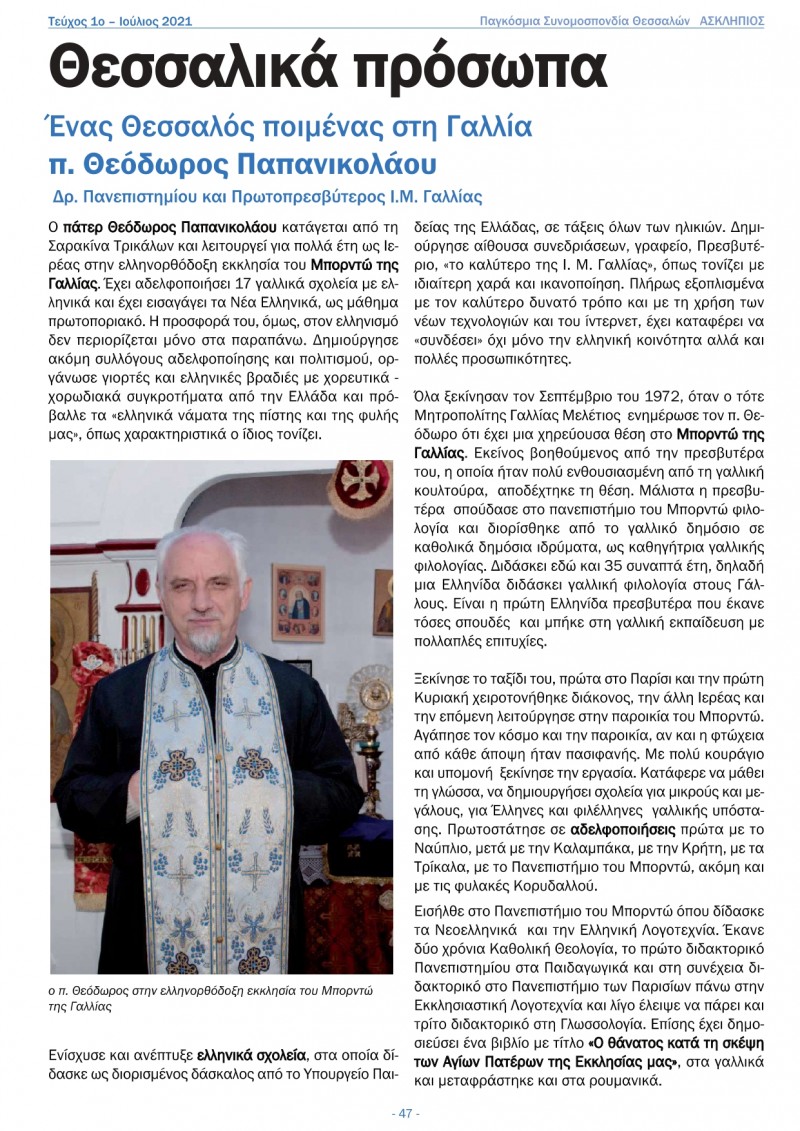 Στο 1ο τεύχος του περιοδικού της Παγκόσμιας Συνομοσπονδίας Θεσσαλών Ασκληπιός γίνεται αναφορά για τον συντοπίτη μας π. Θεόδωρο Παπανικολάου από την Σαρακίνα Καλαμπάκας που ζει στην Γαλλία.