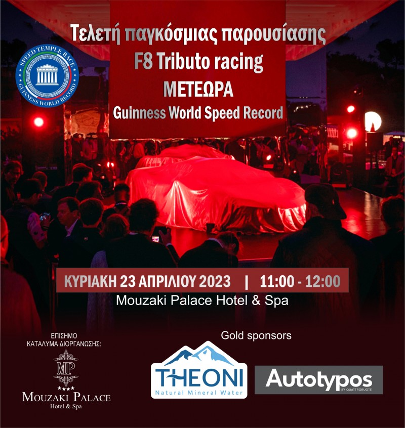 Στις 25 Απριλίου 2023 στην Θεσσαλία θα λάβει χώρα η Τελετή Παγκόσμιας Παρουσίασης F8 Tributo Racing METEORA GUINNESS WORLD SPEED RECORD 2023, μια εντυπωσιακή εκδήλωση που σκοπό έχει την εναλλακτική τουριστική προβολή των Μετεώρων και του Μουζακίου.
