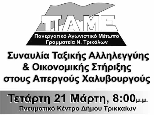 Η Γραμματεία Ν. Τρικάλων του ΠΑΜΕ την Τετάρτη 21 Μάρτη στις 8 μ.μ, στο Πνευματικό Κέντρο του Δήμου Τρικκαίων διοργανώνει Συναυλία Ταξικής Αλληλεγγύης & Οικονομικής Στήριξης στους Απεργούς Χαλυβουργούς.