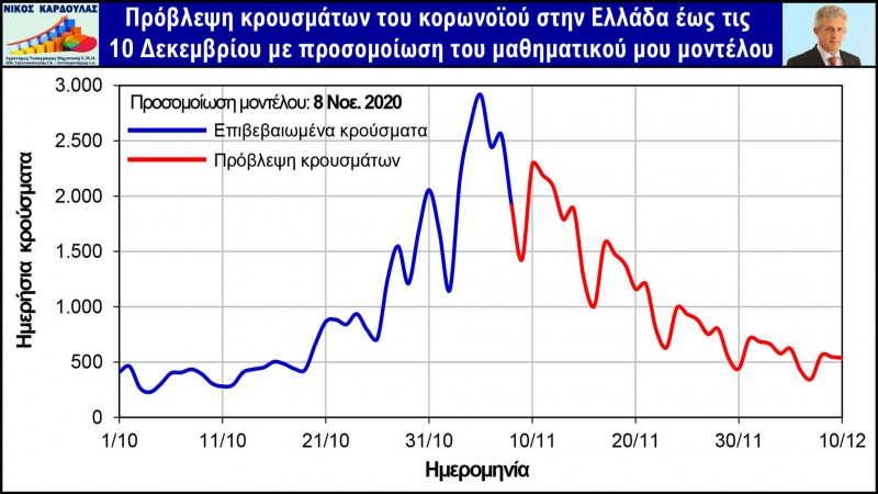 Ενσωματώνοντας στο μαθηματικό μοντέλο και τα επιβεβαιωμένα δεδομένα της περασμένης εβδομάδας, διαπιστώθηκε μετά τη σχετική προσομοίωση ότι η κορύφωση των κρουσμάτων συνέβη στις 5 Νοεμβρίου, όπου επιβεβαιώθηκαν από τον ΕΟΔΥ 2.917 κρούσματα και η πανδημία βρίσκεται πλέον σε καθοδική πορεία, γεγονός που σημαίνει ότι τα μέτρα του καθολικού lockdown αρχίζουν να αποδίδουν.