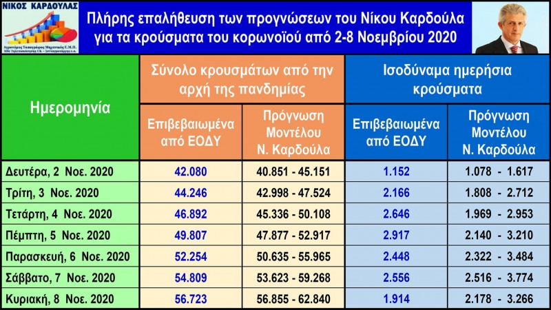 Στον παρακάτω πίνακα, όπου αποτυπώνονται τα επιβεβαιωμένα από τον ΕΟΔΥ δεδομένα και οι προγνώσεις του μαθηματικού μου μοντέλου, φαίνεται η παραπάνω επαλήθευση του μοντέλου.