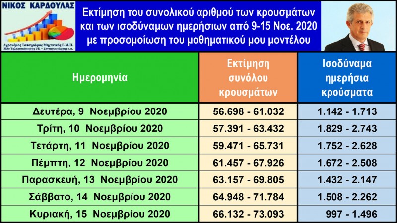 Εκτιμάται ότι ο συνολικός αριθμός των κρουσμάτων από την αρχή της πανδημίας, στο τέλος της τρέχουσας εβδομάδας την Κυριακή 15 Νοεμβρίου θα κυμαίνεται από 66.132 έως 73.093 και τα ισοδύναμα ημερήσια κρούσματα θα κυμαίνονται μέσα στην εβδομάδα από 1.142 έως 2.723.