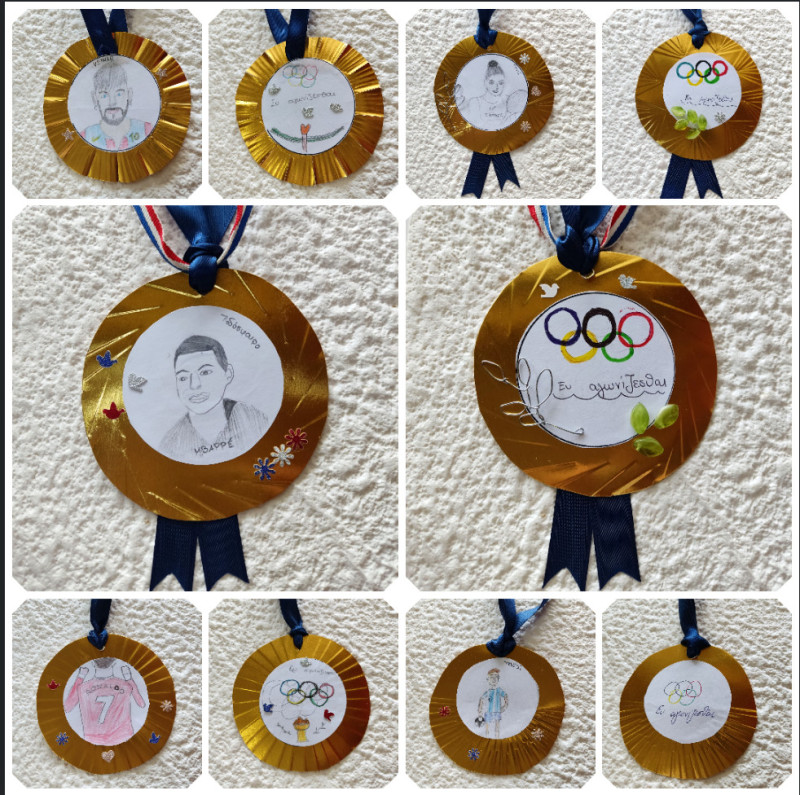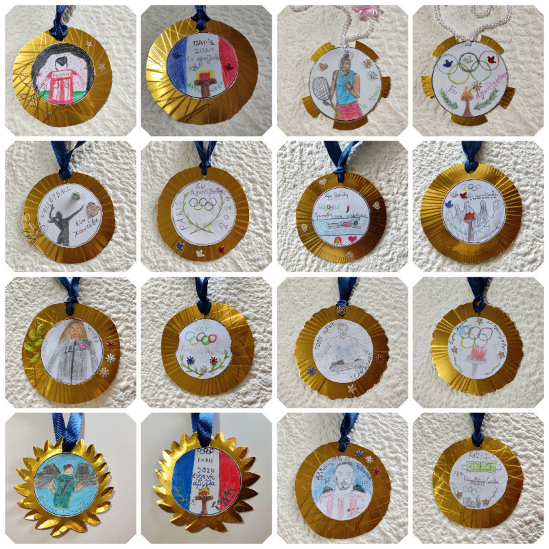Στη συνέχεια, συμμετείχαν στην δράση-διαγωνισμό του προγράμματος «Δημιουργικές Καλλιτεχνικές Εργασίες Έκφρασης» με θέμα «Κατασκευή του δικού μου μεταλλίου». Αντλώντας έμπνευση από παλιά γαλλικά μετάλλια και ακολουθώντας συγκεκριμένες οδηγίες, δημιούργησαν το δικό τους μετάλλιο, ζωγραφίζοντας τον αγαπημένο/η τους αθλητή/τρια, έγραψαν πάνω σε αυτό την Ολυμπιακή αξία που πιστεύουν ότι εκφράζει ο συγκεκριμένος αθλητής/τρια, πρόσθεσαν τους Ολυμπιακούς κύκλους, το φιλοτέχνησαν, το φόρεσαν σαν πραγματικοί Ολυμπιονίκες και τέλος φωτογράφησαν τα μετάλλιά τους για να στείλουν τις δημιουργίες τους στην διοργανώτρια επιτροπή.
