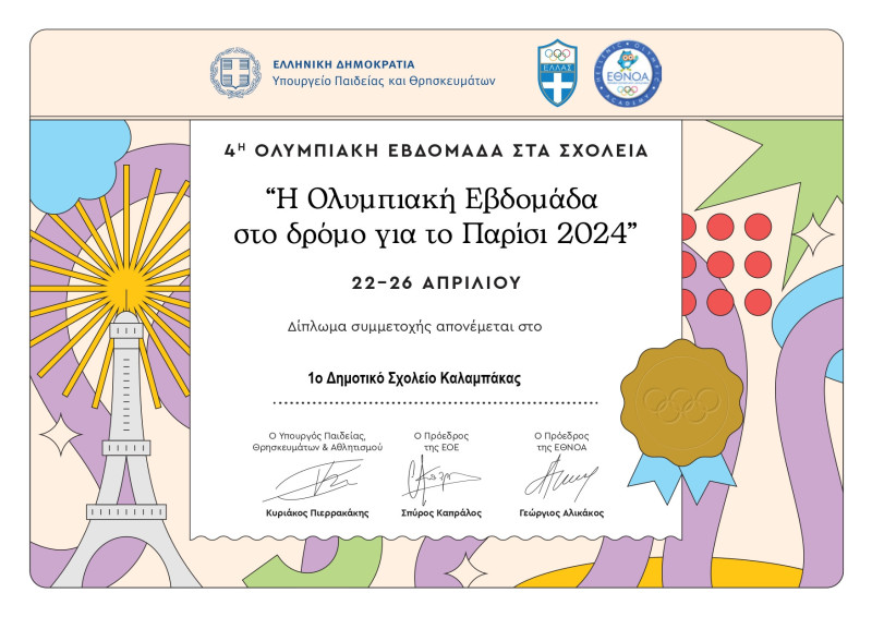Οι μαθητές της Ε’ και ΣΤ’ τάξης του σχολείου μας, στο μάθημα των γαλλικών και με αφορμή τους Ολυμπιακούς και Παραολυμπιακούς αγώνες στο Παρίσι το καλοκαίρι 2024, συμμετείχαν στο καινοτόμο εκπαιδευτικό πρόγραμμα «Ολυμπιακή Παιδεία – 4η Ολυμπιακή Εβδομάδα “στο δρόμο για το Παρίσι 2024”, το οποίο υλοποιείται για τέταρτη συνεχόμενη σχολική χρονιά από την Ελληνική Ολυμπιακή Επιτροπή (ΕΟΕ), την Εθνική Ολυμπιακή Ακαδημία (ΕΘΝΟΑ), και σε συνεργασία με τη Διεύθυνση Φυσικής Αγωγής του Υ.ΠΑΙ.Θ.Α., στο σύνολο σχεδόν των δημοτικών και γυμνασίων σχολείων της Ελλάδας, της Κύπρου και της Ομογένειας. Ο σχεδιασμός και η υλοποίηση της Ολυμπιακής Εβδομάδας, αποτελεί μία καινοτομία αφού συνδέει την εξ αποστάσεως εκπαίδευση και την εκπαιδευτική πράξη με εισαγωγή νέων ιδεών και πρακτικών στην εκπαιδευτική διαδικασία.