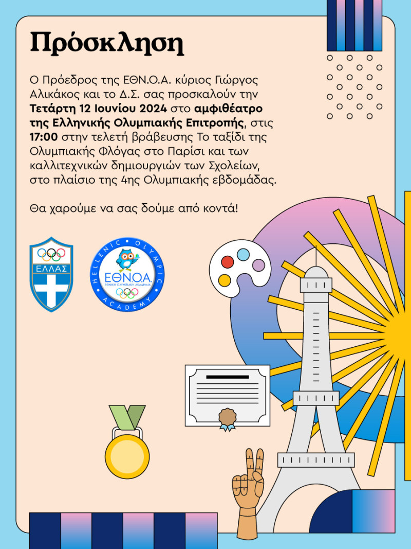 Ο Πρόεδρος της Εθνικής Ολυμπιακής Ακαδημίας (ΕΘΝ.Ο.Α.) και το Δ.Σ με την λήξη του προγράμματος και κατόπιν της ανακοίνωσης των αποτελεσμάτων των δράσεων και διαγωνισμών που υλοποιήθηκαν, απέστειλε πρόσκληση στην τελετή βράβευσης συνοδευόμενη από: