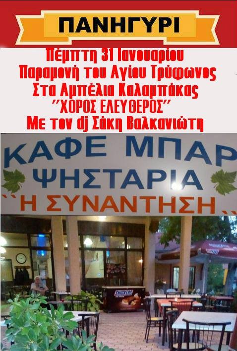Πέμπτη 31 Ιανουαρίου παραμονή του Αγίου Τρύφωνος στο κατάστημα « Η Συνάντηση» του Φίλιππου Τσιούμα θα πραγματοποιηθεί και φέτος το καθιερωμένο Πανηγύρι!