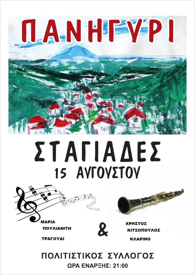 Πανηγύρι στις Σταγιάδες το Δεκαπενταύγουστο Ανακοινώσεις Από admin Δημοσίευση Αυγ 7, 2024 -9:51 0 658 Κοινοποίηση FacebookTwitterΗλεκτρονικό ΤαχυδρομείοViber Την Πέμπτη 15 Αυγούστου θα πραγματοποιηθεί και φέτος το καθιερωμένο πανηγύρι στις Σταγιάδες Καλαμπάκας από τον Πολιτιστικό Σύλλογο. Θα διασκεδάσετε με την Μαρία Πουλιανίτη καιτον Χρήστο Κιτσόπουλο. Ώρα έναρξης 21:00 το βράδυ 0 658 Κοινοποίηση
