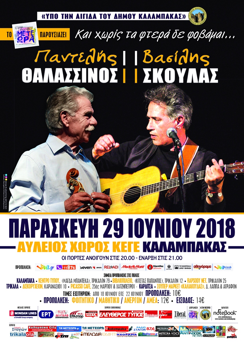 Ο Παντελής Θαλασσινός και ο Βασίλης Σκουλάς, μας καλούν όλες κι όλους, σήμερα Παρασκευή 29 Ιουνίου και ώρα 21:30 στο ΚΕΓΕ Καλαμπάκας, σε μια συναυλιακή εμπειρία, να τη μοιραστούμε, να τη βιώσουμε και να την τραγουδήσουμε μαζί τους!