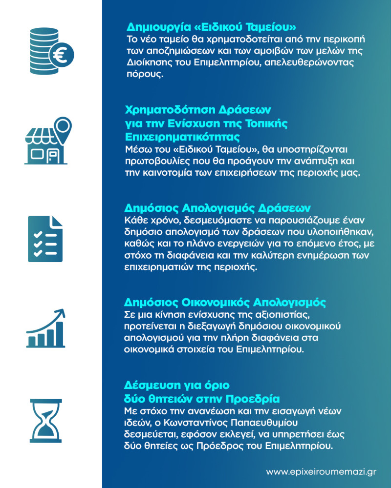- Δέσμευση για όριο δύο θητειών στην Προεδρία: Με στόχο την ανανέωση και την εισαγωγή νέων ιδεών, ο Κωνσταντίνος Παπαευθυμίου δεσμεύεται, εφόσον εκλεγεί, να υπηρετήσει έως δύο θητείες ως Πρόεδρος του Επιμελητηρίου.