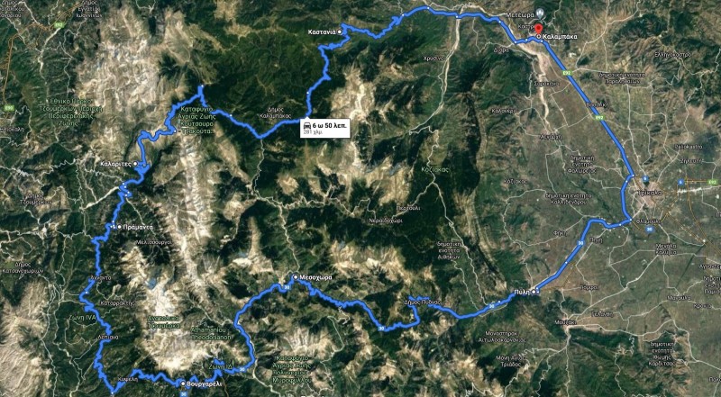 Πιο Συγκεκριμένα η διαδρομή των 280 χλμ.  είναι : Καλαμπάκα – Πύλη – Μεσοχώρα – Βουλγαρέλι Άρτας – Άγναντα – Πράμαντα – Καλαρίτες – Ασπροπόταμος – Καστανιά –Καλαμπάκα , και είναι περίπου 7 ώρες  οδήγηση.