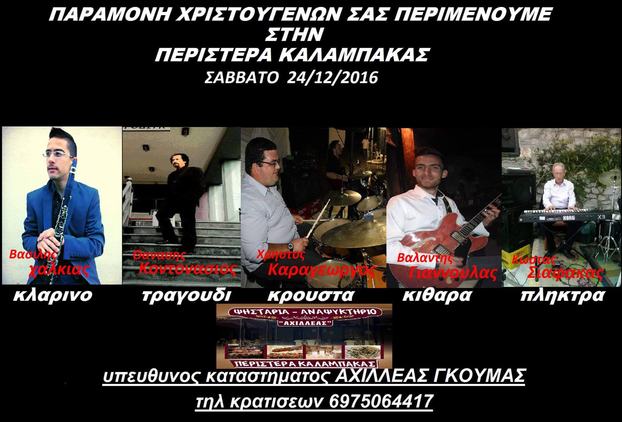 Σάββατο βράδυ 25 Δεκεμβρίου διασκεδάστε στην Περιστέρα Καλαμπάκας στου «Αχιλλέα» με τους παρακάτω μουσικούς