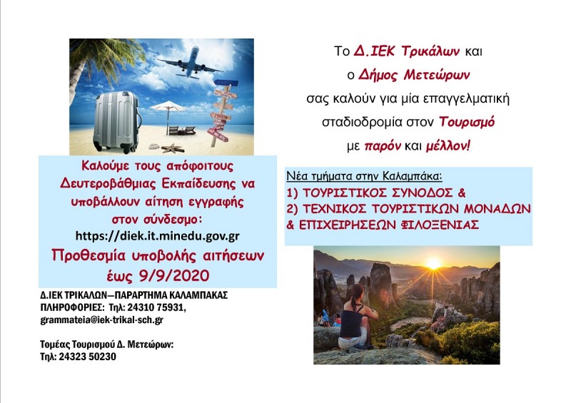 Παράρτημα Δ. ΙΕΚ Καλαμπάκας – Υποβολή αιτήσεων Ανακοινώσεις Από admin Δημοσίευση Σεπ 3, 2020 -19:14 0 1.770 Κοινοποίηση FacebookTwitterΗλεκτρονικό ΤαχυδρομείοViber Καλούμε τους απόφοιτους Δευτεροβάθμιας Εκπαίδευσης να υποβάλλουν αίτηση εγγραφής για τα νέα Τμήματα Τουρισμού στο Δ.ΙΕΚ Τρικάλων παράρτημα Καλαμπάκας, έως τις 9-9-2020. Πληροφορίες: 0 1.770 Κοινοποίηση