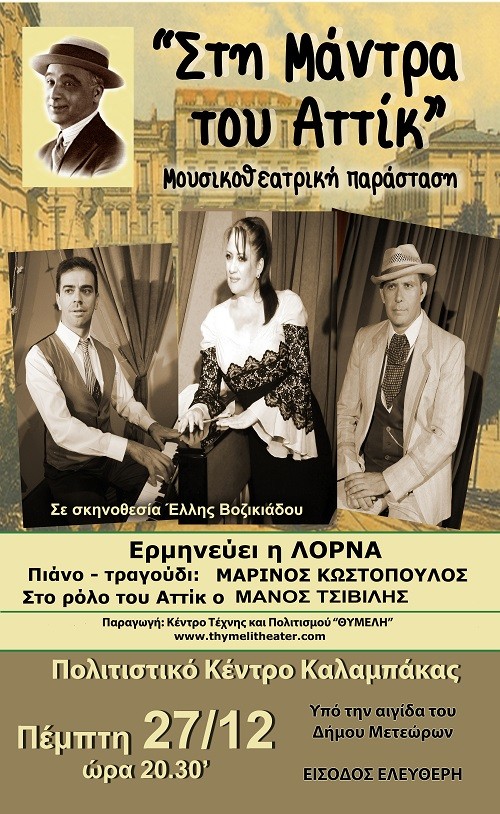 Σήμερα 27 Δεκεμβρίου και ώρα 20:30 στο Πολιτιστικό Κέντρο Καλαμπάκας, έχουμε την ευκαιρία να απολαύσουμε την επιτυχημένη μουσικοθεατρική παράσταση «Στη μάντρα του Αττίκ» κατά την οποία, αθάνατες μελωδίες του πιο διαχρονικού συνθέτη του 20ου αιώνα, του Κλέωνα Τριανταφυλλίδη κατά κόσμον «Αττίκ», επαναφέρουν στην ψυχή μας χρώματα, αρώματα και συναισθήματα της προπολεμικής και μεταπολεμικής Αθήνας, επιβεβαιώνοντας για μία ακόμη φορά την ανεξίτηλη αξία τους.