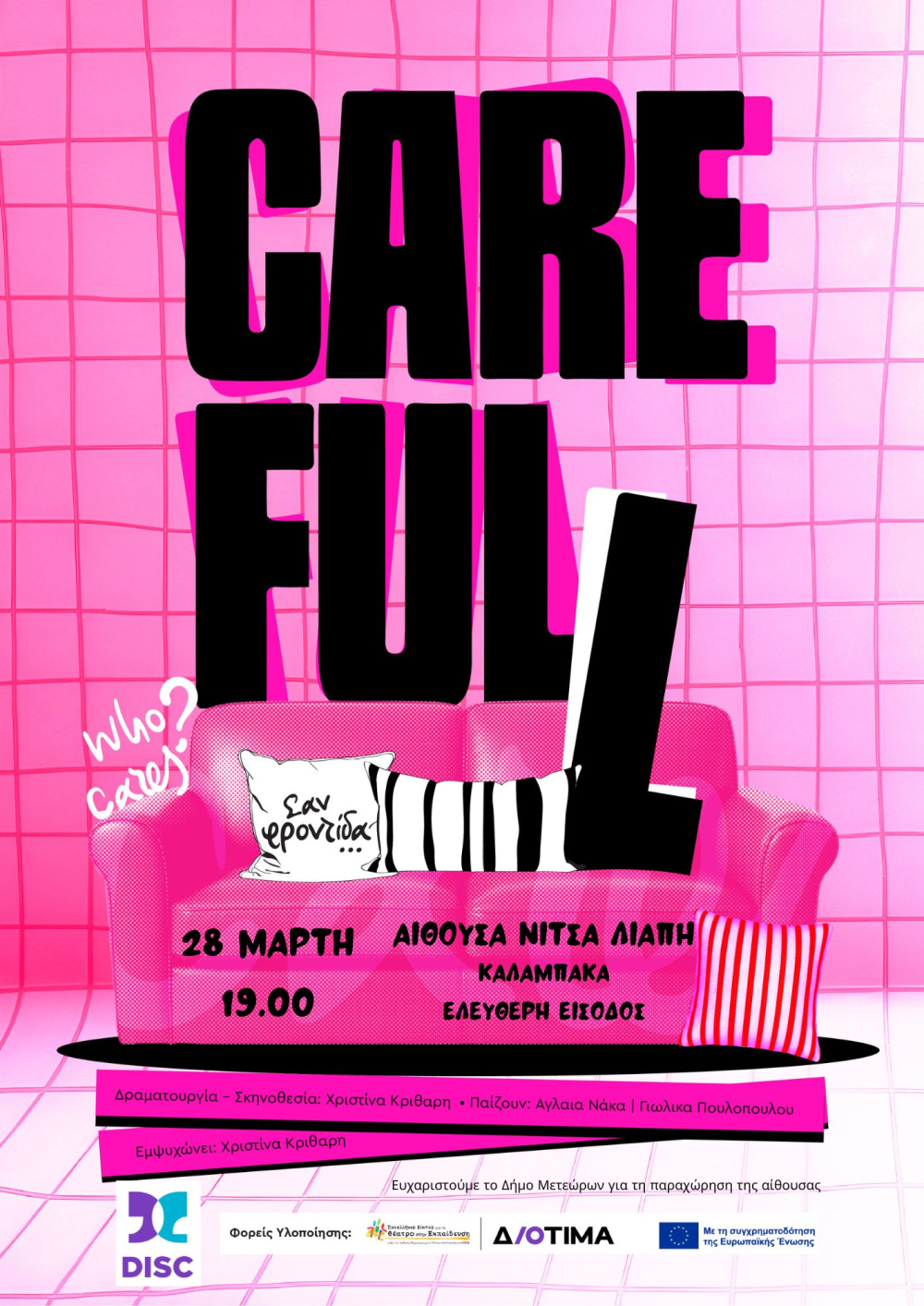 Η παράσταση “Carefull” δημιουργήθηκε στο πλαίσιο του έργου «DISC – Θεατροπαιδαγωγικές παρεμβάσεις για τα έμφυλα στερεότυπα και το ισότιμο μοίρασμα της φροντίδας» με φορείς υλοποίησης το Πανελλήνιο Δίκτυο για το Θέατρο στην Εκπαίδευση TENet-Grκαι το Κέντρο #ΔΙΟΤΙΜΑ στο πλαίσιο του Προγράμματος CERV-2024-GE, με τη συγχρηματοδότηση της Ευρωπαϊκής Επιτροπής.
