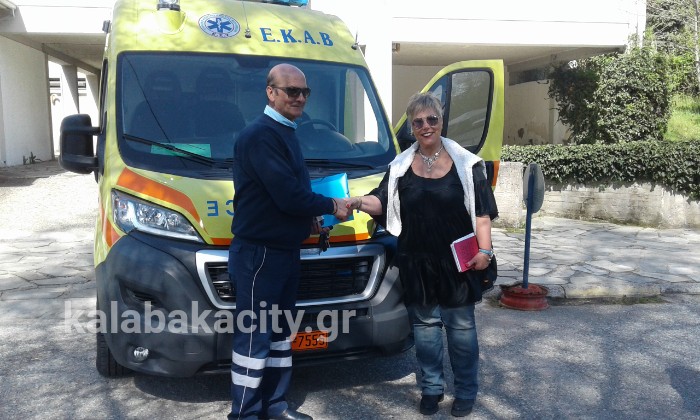 Τα κλειδιά του νέου ασθενοφόρου 4χ4 πήρε στα χέρια του, την Τρίτη το μεσημέρι από την Διευθύντρια του ΕΚΑΒ Θεσσαλίας κα Αυγέρη, ο υπεύθυνος του παραρτήματος ΕΚΑΒ που στεγάζεται στο Κ. Υ. Καλαμπάκας, κ. Γιώργος Κοντογώγος.