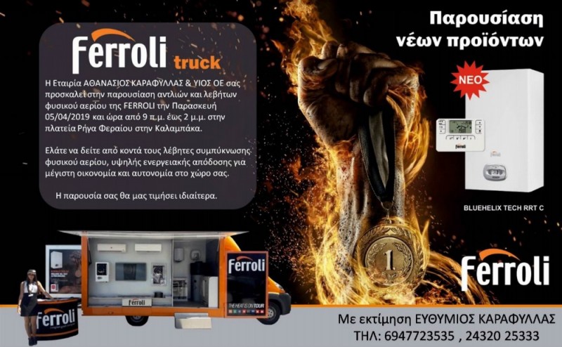 Η εταιρεία Αθανάσιος Καραφύλλας και ΥΙΟΣ Ο.Ε. σας προσκαλεί στην παρουσίαση αντλιών και λεβήτων φυσικού αερίου της Ferroli την Παρασκευή 5 Απριλίου και ώρα 9:00 το πρωί έως 2:00 το μεσημέρι στην πλατεία Ρήγα Φεραίου στην Καλαμπάκα.