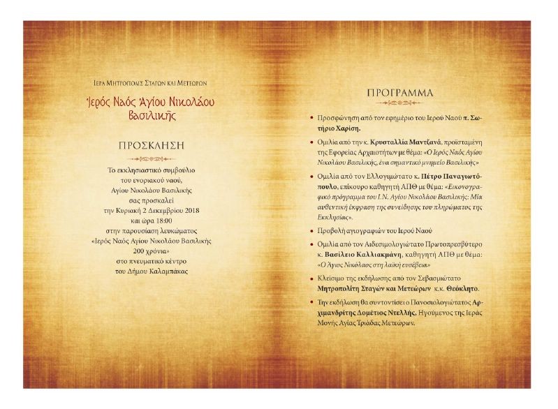 Την Κυριακή 2 Δεκεμβρίου στο Πολιτιστικό Κέντρο Καλαμπάκας στις 18:00 θα γίνει η παρουσίαση του Λευκώματος « Ιερός Ναός Αγίου Νικολάου Βασιλικής – 200 χρόνια » από το εκκλησιαστικό συμβούλιο του Ι.Ν Αγίου Νικολάου.
