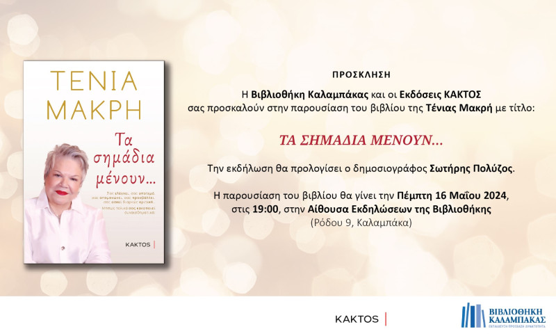 Την Πέμπτη 16/5/2024 στις 7 μ.μ. έχουμε την χαρά να υποδεχθούμε στη Βιβλιοθήκη την κα Τένια Μακρή για την παρουσίαση του νέου της βιβλίου “Τα σημάδια μένουν…”.
