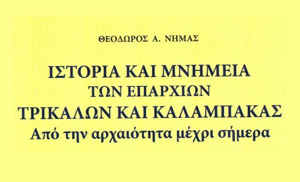 Την Πέμπτη 18 Οκτωβρίου και ώρα 7 μ.μ., στην αίθουσα «Νίτσα Λιάπη» στην Καλαμπάκα, θα γίνει η παρουσίαση του νέου βιβλίου του Τρικαλινού φιλολόγου και ιστορικού Θεοδώρου Α. Νημά με τίτλο “Ιστορία και Μνημεία των επαρχιών Τρικάλων και Καλαμπάκας. Από την αρχαιότητα μέχρι σήμερα”, Θεσσαλονίκη, Εκδοτικός Οίκος Κ. & Μ. Αντ. Σταμούλη, 2018, σσ. 672.