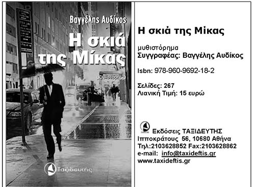 Ο Σύλλογος Ηπειρωτών ν. Τρικάλων, η Φιλεκπαιδευτική Αδελφότητα Τζούρτζας Ασπροποτάμου (ΦΑΤΑ), το βιβλιοπωλείο ΚΗΡΗΘΡΕΣ και οι εκδόσεις ΤΑΞΙΔΕΥΤΗΣ σας προσκαλούν την Πέμπτη, 3 Απριλίου 2014, 7.30 μμ, στην αίθουσα του Δημοτικού Συμβουλίου του Δήμου Τρικκαίων στην παρουσίαση του νέου μυθιστορήματος του Βαγγέλη Αυδίκου “Η σκιά της Μίκας”