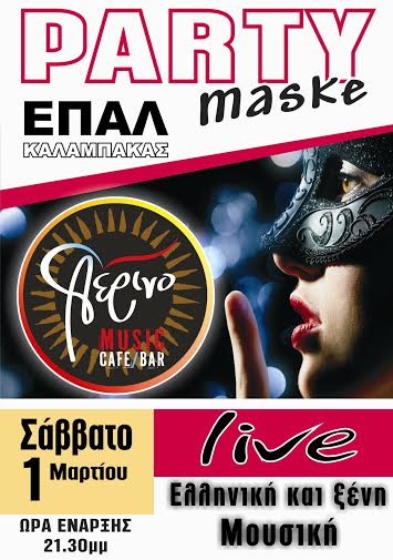 Πάρτι μασκέ διοργανώνουν οι μαθητές του ΕΠΑΛ Καλαμπάκας το Σάββατο 1 Μαρτίου στο μουσικό καφέ ΑΕΡΙΝΟ της πόλης μας.