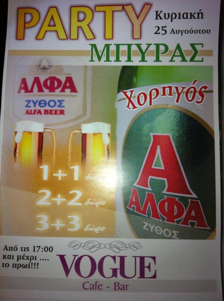 Party μπύρας διοργανώνει την Κυριακή 25 Αυγούστου το cafe – bar VOGUE που βρίσκεται στην πλατεία Δημουλά της πόλης μας.