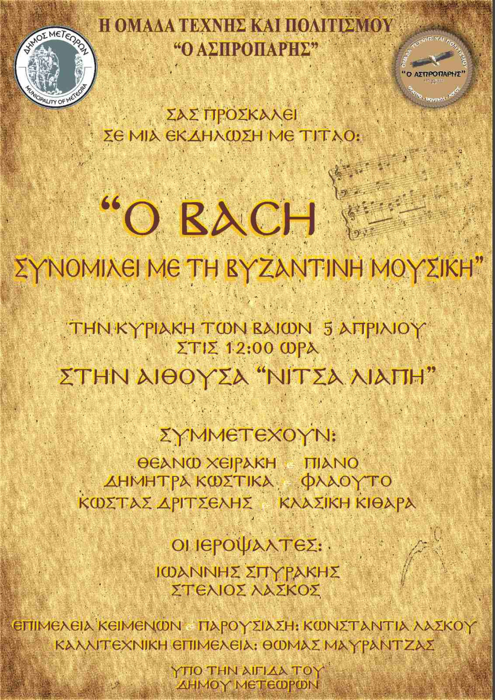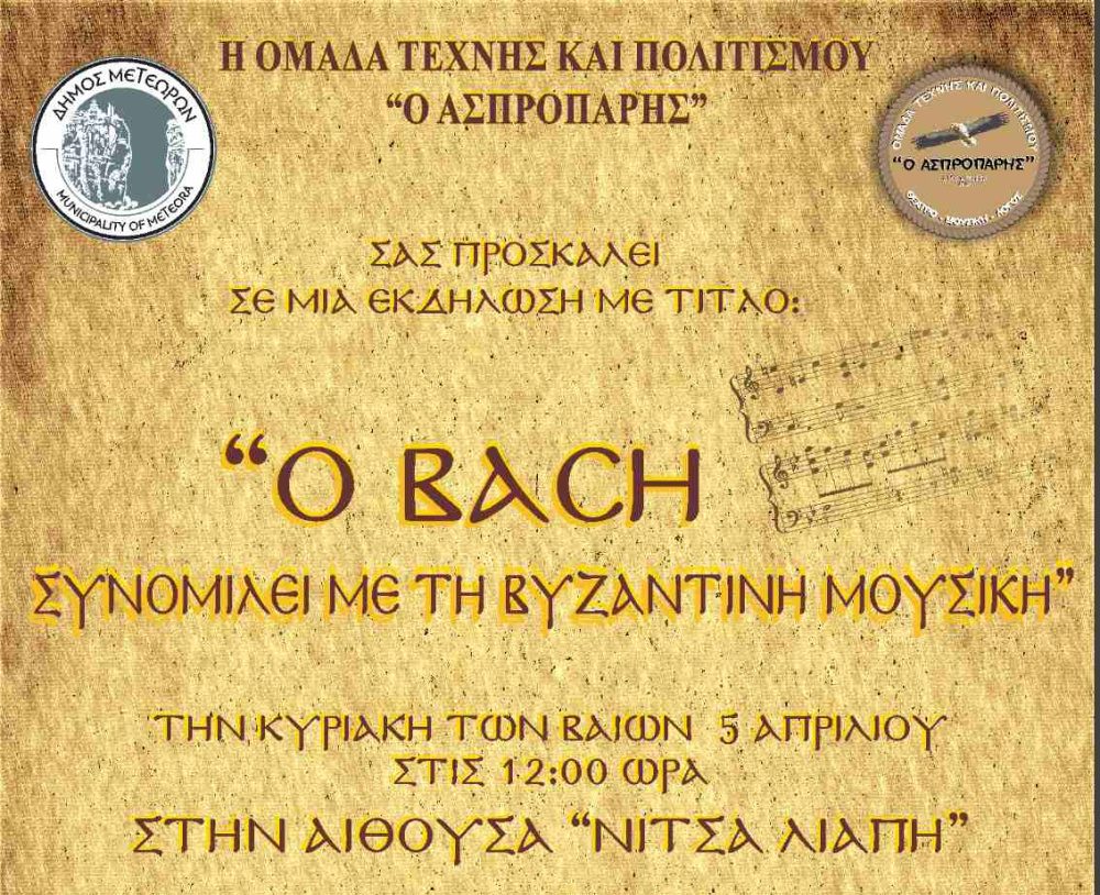 Η Ομάδα Τέχνης και Πολιτισμού «Ο Ασπροπάρης» προσκαλεί το κοινό σε μια ξεχωριστή μουσική εκδήλωση με τίτλο: «Ο Bach συνομιλεί με τη Βυζαντινή Μουσική»