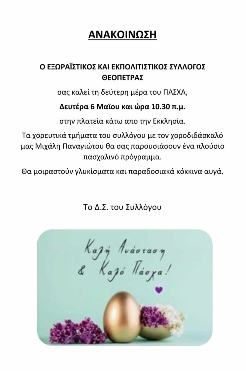 Ο ΕΞΩΡΑΪΣΤΙΚΟΣ ΚΑΙ ΕΚΠΟΛΙΤΙΣΤΙΚΟΣ ΣΥΛΛΟΓΟΣ ΘΕΟΠΕΤΡΑΣ σας καλεί τη δεύτερη μέρα του ΠΑΣΧΑ, Δευτέρα 6 Μαΐου και ώρα 10.30 π.μ. στην πλατεία κάτω απο την Εκκλησία.
