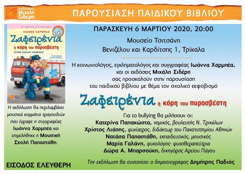 Η Κοινωνιολόγος, εγκληματολόγος και συγγραφέας Ιωάννα Χαρμπέα και οι εκδόσεις Μιχάλη Σιδέρη σας προσκαλούν στην παρουσίαση του παιδικού βιβλίουμε θέμα τον σχολικό εκφοβισμό: