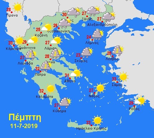 Θερμοκρασίες, στη Βόρεια Ελλάδα από 16 έως 29, στην Κεντρική και Νότια από 22 έως 32 και στις νότιες νησιωτικές περιοχές από 24 έως 35 βαθμούς.