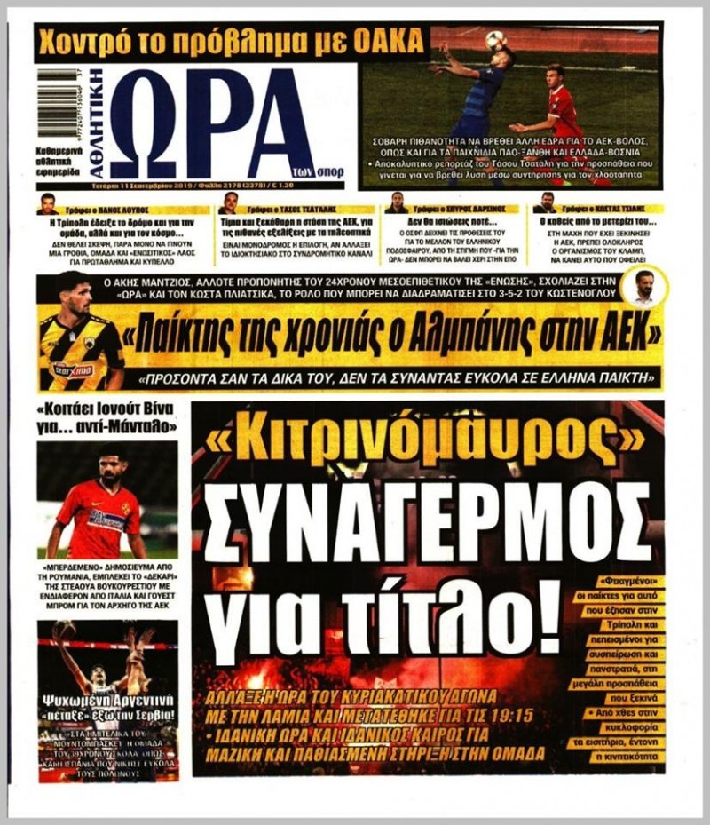 Στο πρωτοσέλιδο της εφημερίδας της 11ης Σεπτεμβρίου, ο προπονητής Άκης Μάντζιος που μίλησε στον Κώστα Πλιάτσικα, τόνισε πως ο Χρήστος Αλμπάνης είναι ο παίκτης της χρονιάς στην ΑΕΚ και πως προσόντα σαν τα δικά του δεν τα συναντάς εύκολα σε Έλληνα παίκτη…