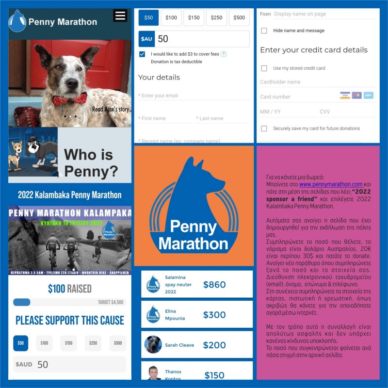 Τo Penny Marathon ξεκίνησε στην Αθήνα, το 2012 και πιστεύουμε ότι είναι ο μοναδικός μαραθώνιος τέτοιου είδους σε όλο τον κόσμο, ενώ Τα χρήματα που συγκεντρώνονται από τους πολύτιμους χορηγούς μας και τις απλόχερες δωρεές του κόσμου χρησιμοποιούνται για τα διάφορα στάδια της διαδικασίας της διάσωσης ενός αδέσποτου αλλά κυρίως για στειρώσεις καθώς μόνο έτσι μπορεί να περιοριστεί και να μη συνεχίσει να αυξάνεται ο αριθμός των αδέσποτων στην Ελλάδα και ειδικά στην επαρχία.