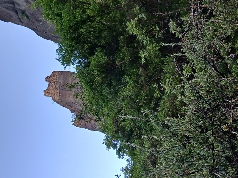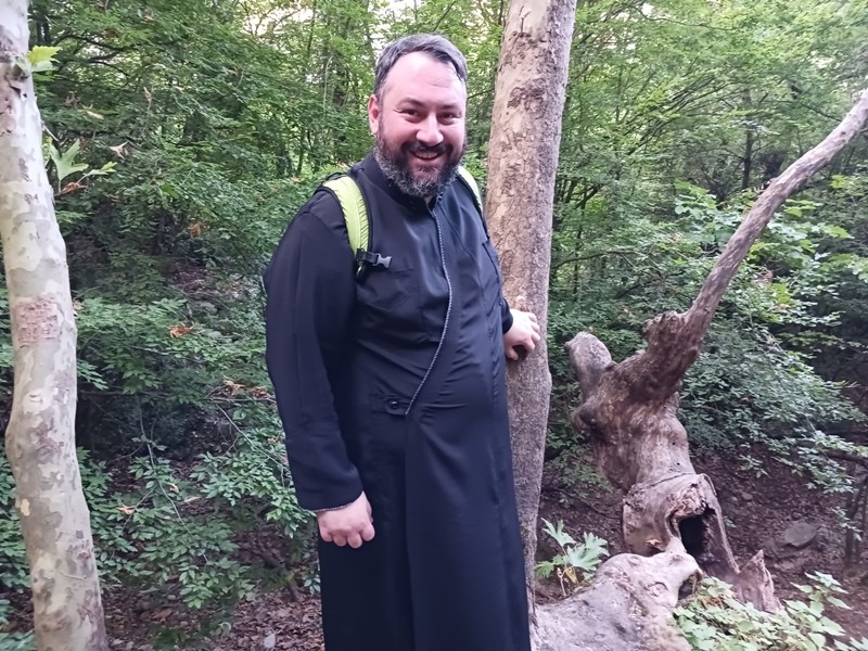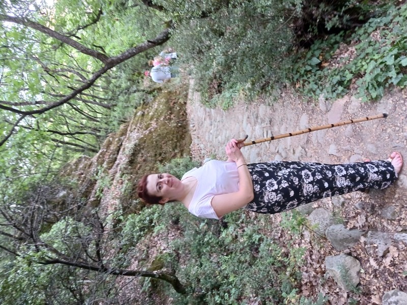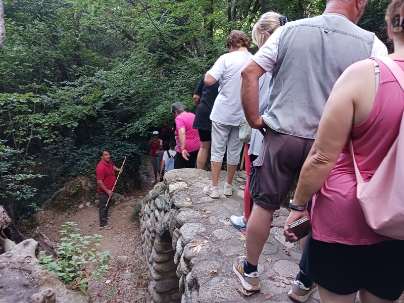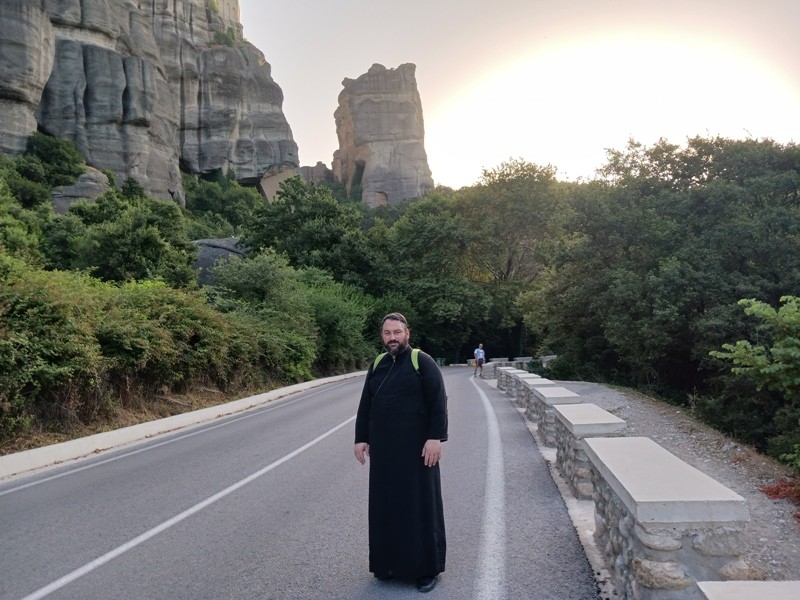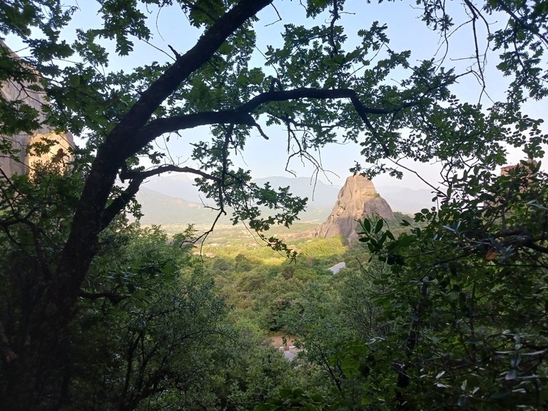Καθώς κατεβαίναμε ο οδηγός βουνού μας εξηγούσε πολλά σημεία της διαδρομής. Θαυμάσαμε τους πελώριους βράχους, τον ίσκιο που δημιουργεί η συνάντηση των μετεωρίτικων βράχων και των δέντρων των μονοπατιών, το πράσινο της φύσης που ηρεμεί, τη δροσιά των δέντρων. Σε κάποιο σημείο το βίωμα έγινε εντονότερο. Μέσα στην ομορφιά της φύσης που ο Θεός δημιούργησε με τρόπο καλλιτεχνικό, ακούγονταν οι ψαλμωδίες που προέρχονταν από την Ιερά Μονή Ρουσάνου, πραγματικά απίστευτη και μοναδική στιγμή μέσα στη φύση υπό τις ευλογιών των αγίων μορφών των μοναστηριών μας.