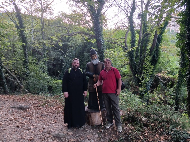 Τέλος, φτάσαμε στο τέλος της διαδρομής. Εκεί όπου άρχισε να αχνοφέγγει το ξύλινο γλυπτό με τη μορφή του αγίου Παϊσίου. Σταθήκαμε και θαυμάσαμε με δέος την μορφή του αγίου. Όλοι μας εσωτερικά απευθύναμε μυστικές ικεσίες και δοξολογίες για τις ομορφιές της φύσης και της ζωής που ο Θεός μας δώρισε και μας δωρίζει. Ακολούθως, βγήκαμε στο δρόμο και βρεθήκαμε περικυκλωμένοι από τους επιβλητικούς βράχους των Μετεώρων. Κατευθυνθήκαμε προς την Ιερά Μονή Αγίου Νικολάου Αναπαυσά όπου και μας περίμενε ο οδηγός μας ο Στάθης για να μας μεταφέρει πάλι πίσω στην Διάβα.