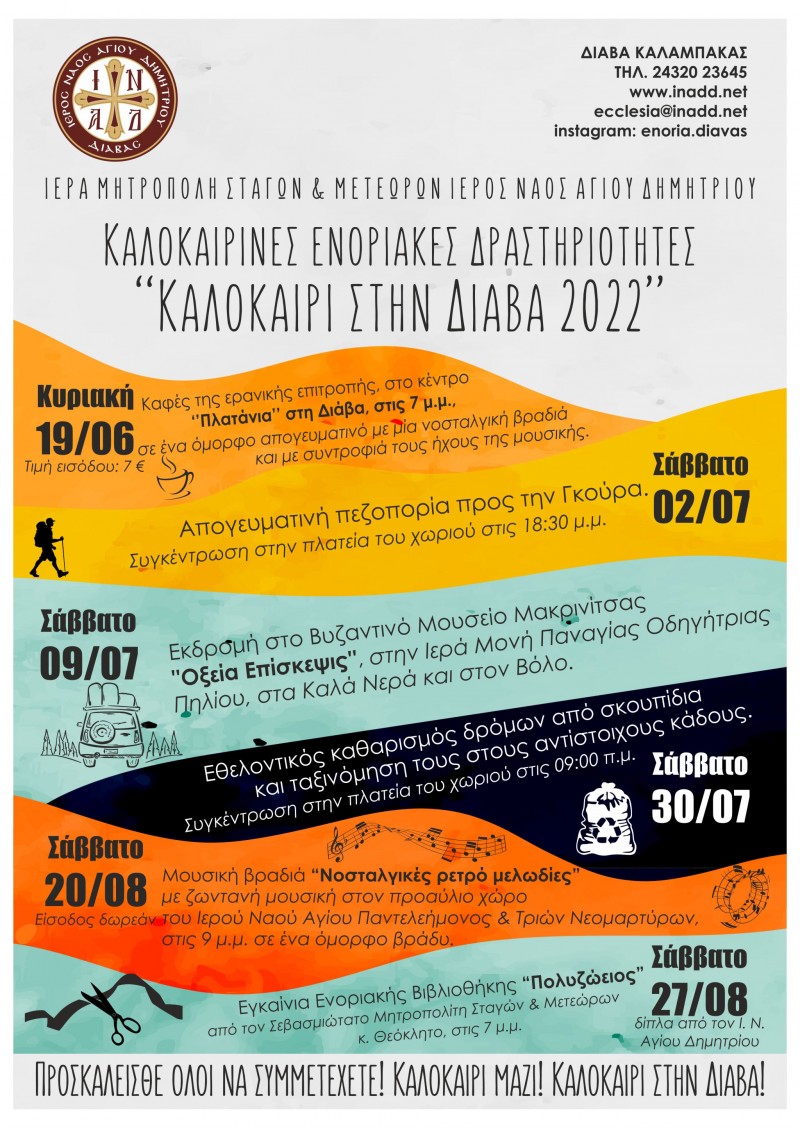 Στα πλαίσια των φετινών καλοκαιρινών εκδηλώσεων και δράσεων ‘’Καλοκαίρι στην Διάβα 2022’’ που διοργανώνει για πρώτη φορά η ενορία Αγίου Δημητρίου Διάβας και από φέτος καθιερώνονται, αυτό το Σάββατο 2 Ιουλίου ξεκινάμε την πεζοπορία μας!