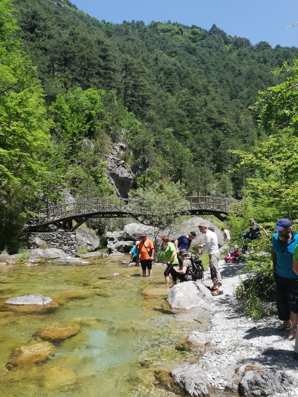 Η πορεία συνεχίστηκε μέσα από το καταπράσινο τοπίο του φαραγγιού με τους ήχους του ποταμού και της φύσης να μας συνοδεύουν. Περάσαμε στο σύνολο 7 ξύλινα γεφύρια και σε ένα από αυτά κάναμε την απαραίτητη στάση για φωτογραφίες και ένα μικρό κολατσιό. Πολλοί πήραν μία ανάσα δροσιάς βουτώντας τα πόδια τους στα παγωμένα νερά του Ενιπέα.