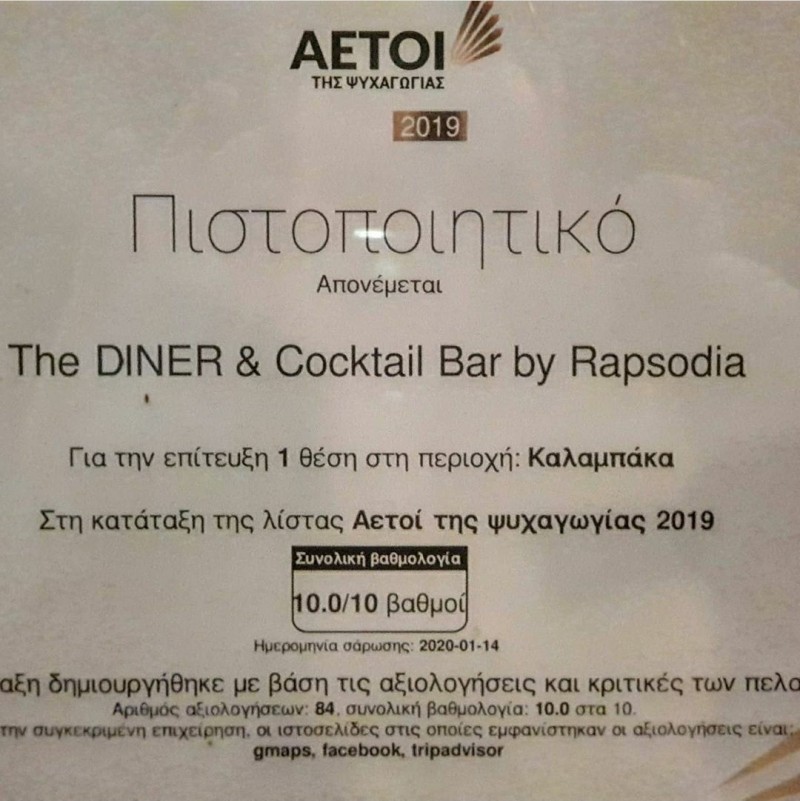 Μια σπουδαία διάκριση και θέση την οποία κέρδισε μέσα από τις αξιολογήσεις και κριτικές των πελατών του, πέτυχε το κατάστημα THE DINER & Cocktail Bar by RAPSODIA της Καλαμπάκας, παίρνοντας το σχετικό βραβείο στον θεσμό ΑΕΤΟΙ της ΨΥΧΑΓΩΓΊΑΣ 2019.