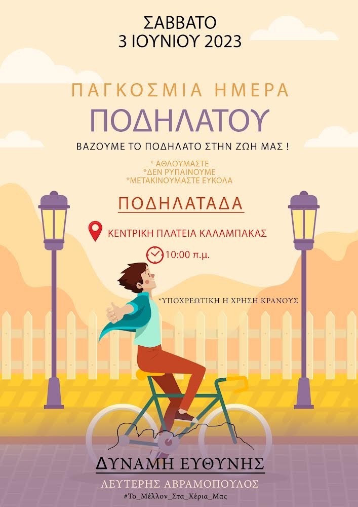Η 3η Ιουνίου τιμάται παγκόσμια ως «ημέρα ποδηλάτου» κι εμείς στέλνουμε μήνυμα από εδώ, από τα Μετέωρά μας, από την πόλη της Καλαμπάκας και βγαίνουμε στους δρόμους με αυτά. Φοράμε κράνος (… απαραίτητα) και δίνουμε ραντεβού στην πλατεία το Σάββατο 3 Ιουνίου στις 10 π.μ..