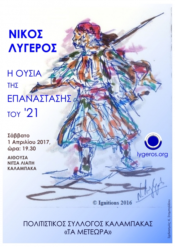 Ο Πολιτιστικός Σύλλογος Καλαμπάκας «ΤΑ ΜΕΤΕΩΡΑ» διοργανώνει , στα πλαίσια του εορτασμού της 25ης Μαρτίου, εκδήλωση – ομιλία με θέμα «Η Ουσία της επανάστασης του 21» και ομιλητή τον διακεκριμένο επιστήμονα Νίκο Λυγερό.