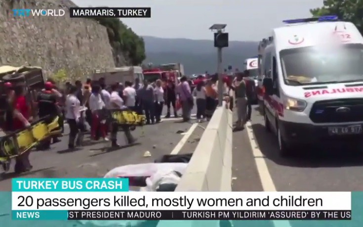 Με αίμα βάφτηκε η άσφαλτος κοντά στην πόλη Μαρμαρίδα, στην Τουρκία, όταν τουριστικό λεωφορείο ανατράπηκε με αποτέλεσμα να χάσουν τη ζωή τους δεκαεπτά άνθρωποι και ακόμα δεκατρείς να τραυματιστούν.