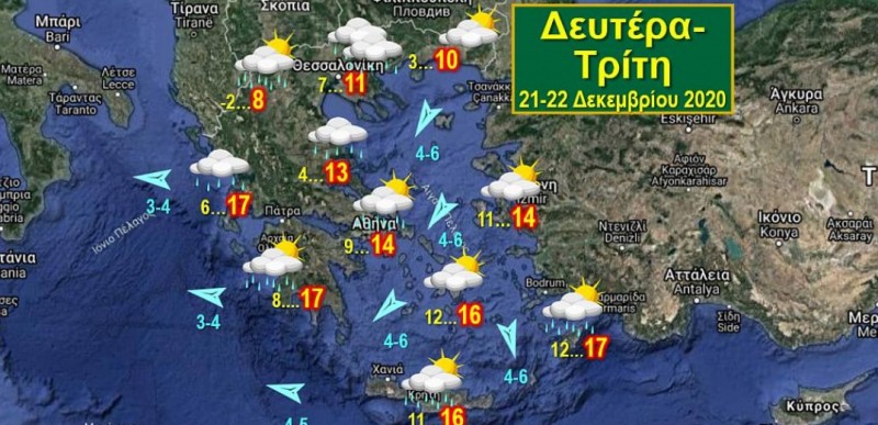 Άνεμοι, στο Ιόνιο Νοτιοανατολικοί 4-5 Μποφόρ, στο Αιγαίο Βορειοανατολικοί 4-6 Μποφόρ. Θερμοκρασίες, στα ηπειρωτικά από -2 έως 17, στις νησιωτικές περιοχές από 11 έως 17 βαθμούς.