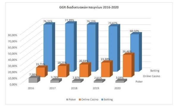 Σταθερή πρόοδο δείχνουν τα Online Casino (περιλαμβάνονται τα slots & το ζωντανό καζίνο). Από το 15,71% του 2016, στο 20,84% του 2018 και στο 36,46% το 2020. Την ίδια στιγμή, το betting σε online στοιχηματικές παραμένει μεν στην κορυφή, όμως παρουσιάζει πτωτική τάση (σε σχέση με το 2019.