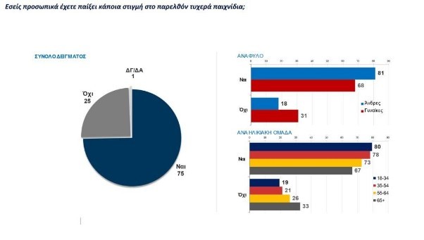 Απαντήσεις στις ανωτέρω ερωτήσεις μας έρχεται να δώσει η Πανελλαδική Έρευνα της Kappa Research* για λογαριασμό της ΕΕΕΠ. Από αυτήν προκύπτουν τα ακόλουθα σημαντικά στοιχεία, όπως για παράδειγμα πως 3/4 (ανεξαρτήτου φύλου) έχουν παίξει στο παρελθόν τυχερά παιχνίδια. Πιο συγκεκριμένα, το 81% των ανδρών και το 68% των γυναικών έχουν απαντήσει καταφατικά.