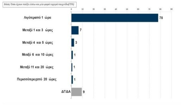 Ιδιαίτερο ενδιαφέρον υπάρχει και στον χρόνο αφιέρωσης των παικτών στα διαδικτυακά παίγνια. Σχεδόν οι 8/10 έχουν αφιερώσει στο παιχνίδι λιγότερο από μια ώρα την εβδομάδα, ενώ το 7% ξοδεύει από μια έως τρεις ώρες. Το 1% των ερωτηθέντων «απασχολείται» περισσότερο από 20 ώρες σε εβδομαδιαία βάση.