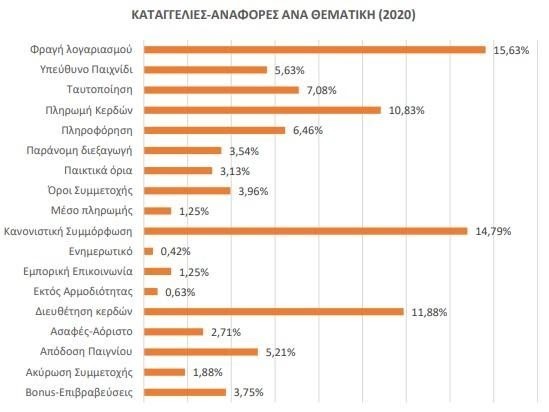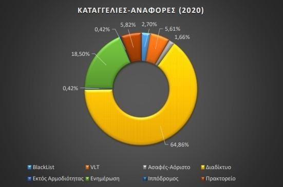 Ιδιαίτερο ενδιαφέρον συγκεντρώνει και η αναφορά της Έκθεσης Πεπραγμένων όσον αφορά στις καταγγελίες-αναφορές για διάφορα ζητήματα που σχετίζονται με την διοργάνωση και διεξαγωγή των παιγνίων. Όπως μπορείτε να δείτε και στο παρακάτω αναλυτικό σχεδιάγραμμά, την μερίδα του λέοντος συγκεντρώνουν οι καταγγελίες-αναφορές που αφορούν το διαδίκτυο, ενώ αμέσως επόμενη κατηγορία σχετίζεται με τα αιτήματα πληροφόρησης ενημέρωσης.