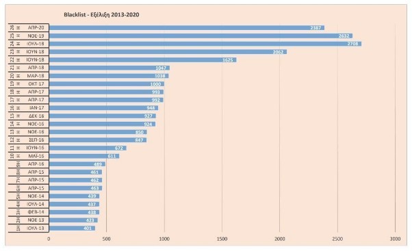Παράλληλα, το έτος 2020 συνεχίστηκε με την ίδια ανοδική πορεία και η διαδικασία εντοπισμού, ελέγχου και εγγραφής στον Κατάλογο μη Αδειοδοτημένων Παρόχων (Blacklist) που τηρεί η ΕΕΕΠ. Μια λίστα που τηρείται από τον Ιούλιο του 2013 και η οποία επικαιροποιείται συνεχώς. Μέχρι και τον Απρίλιο του 2020, οι εγγεγραμένοι ιστότοποι ανέρχονται σε 2.387, από 2.632 που ήταν το Νοέμβριο του 2019.