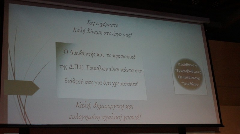 Τις/τους Διευθύντριες/ντες, Προϊστάμενες/νους Δημοτικών Σχολείων, χαιρέτισαν οι σύμβουλοι Εκπαίδευσης, κ. Βασίλειος Κωτούλας (ΠΕ70), κ. Βασίλειος Νάστος (ΠΕ70), κ. Ιωάννης Ζορμπάς (ΠΕ70), η κα Δήμητρα Παπανδρέου (ΠΕ70 ΕΑΕ) και η κα Γεωργία Καραγιάννη (ΠΕ06).