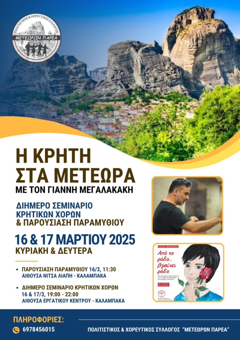 Ο Σύλλογος “Μετεώρων Παρέα” για το διήμερο 16 και 17 Μαρτίου πραγματοποιεί παράλληλα σεμινάρια Κρητικών Χορών. με τον κ. Γιάννη Μεγαλακάκη.